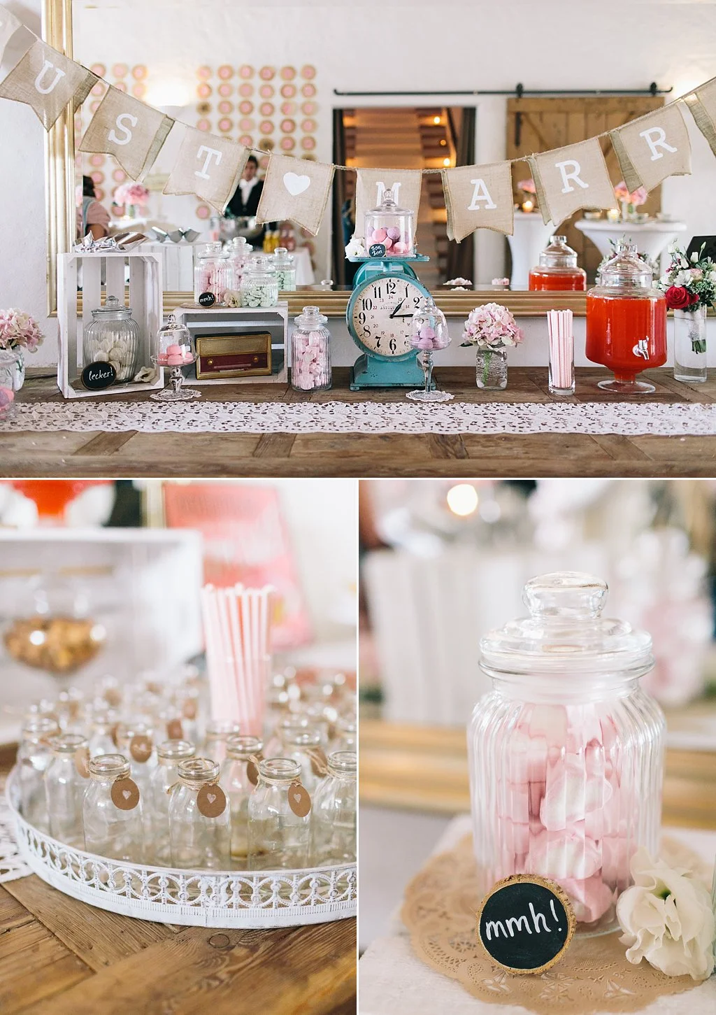 Auf das Dekorationskonzept abgestimmt, entwickelten wir die Tischdekoration, eine Candybar mit Papeterie, die freie Trauung, den Empfang/Kaffee und Kuchen, die Wegbeleuchtung, eine ganz außergewöhnliche, handgefertigte Tischeinteilung und vieles mehr... (Über die Papeterie zu dieser Hochzeit berichteten wir bereits)